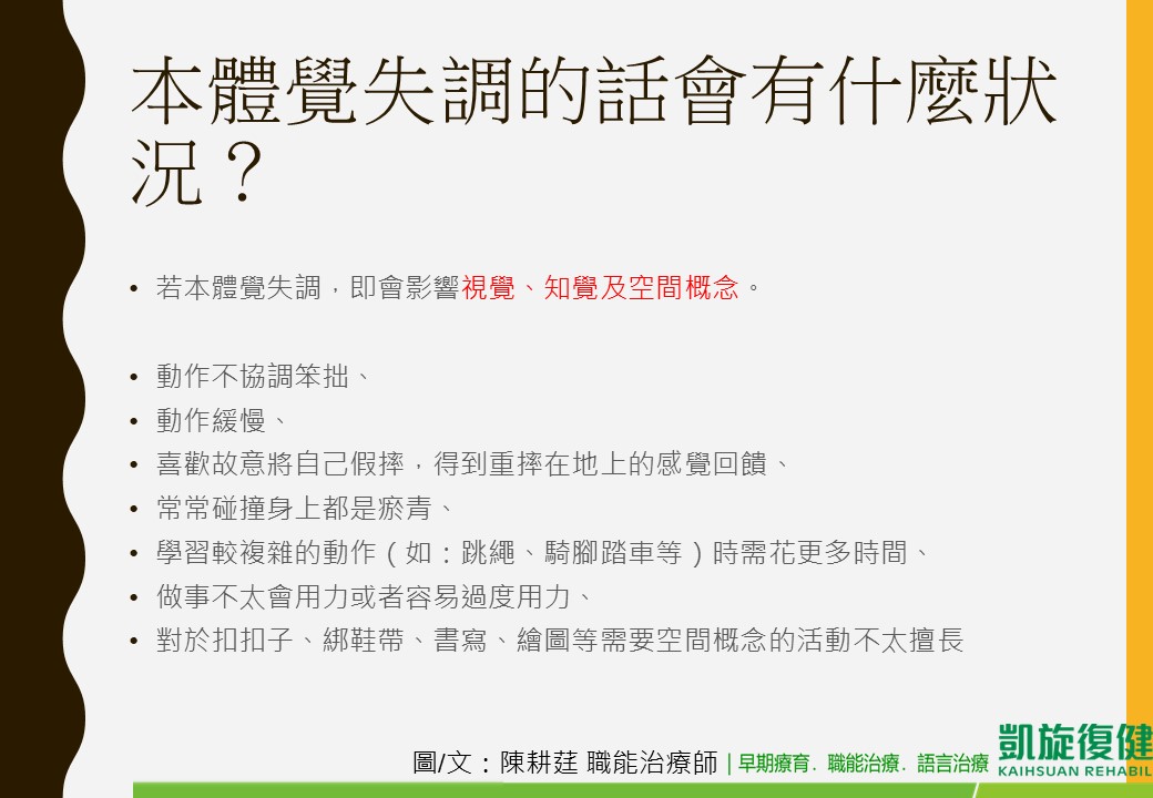 •本體覺正常運作的話,身體便能夠輕鬆做出不同動作,肌肉也能正常收縮,關節也