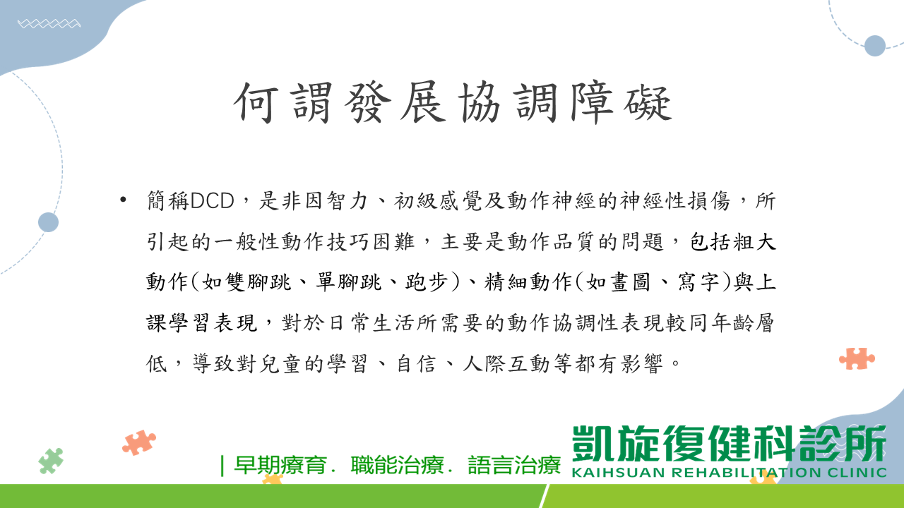 這個月要介紹的是發展協調障礙(DCD),若是家長們發現孩子經常有跌倒、運動困難又或者是書寫時字體不好看、大小不一,