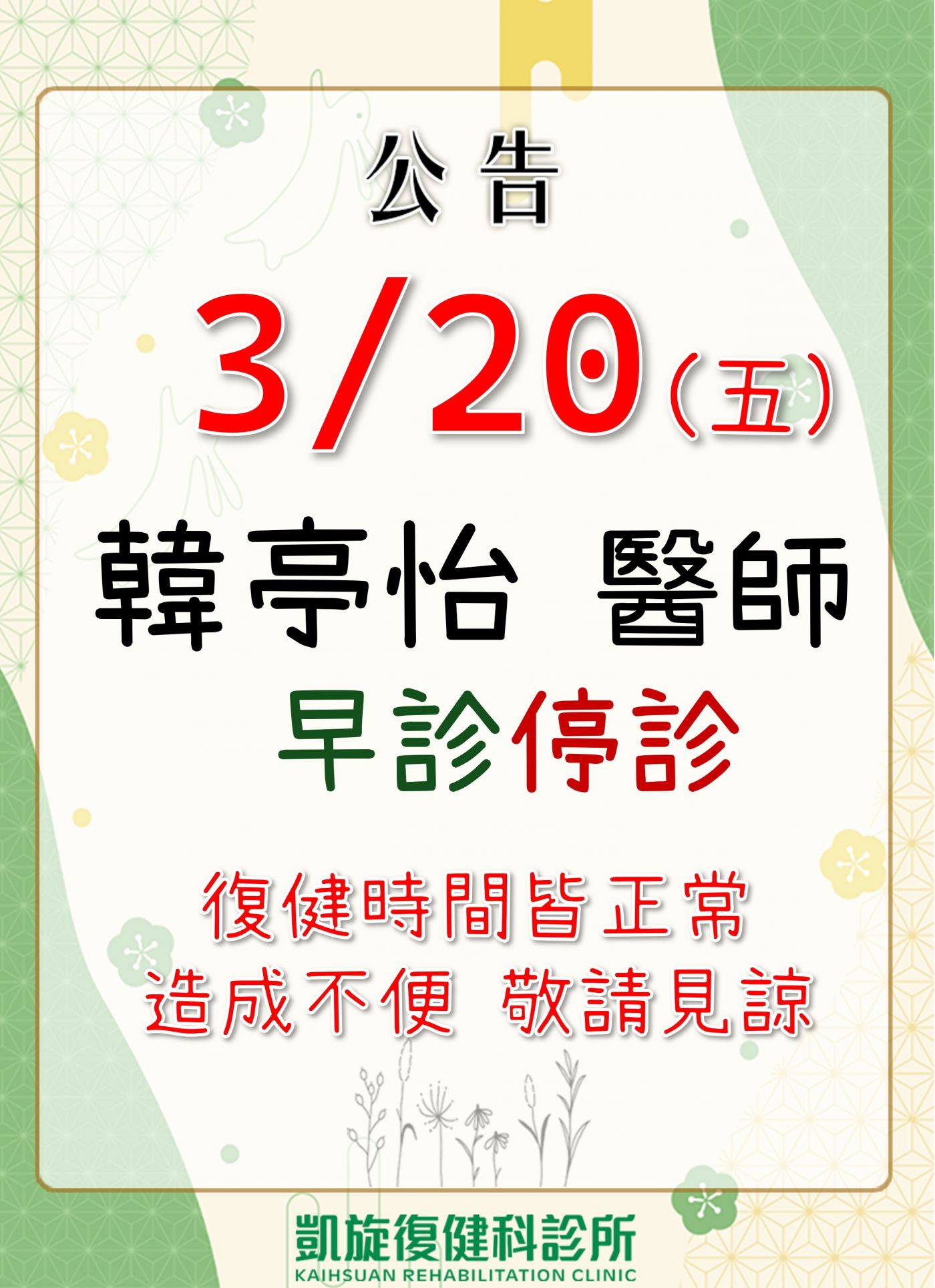 韓亭怡醫師 早診停診