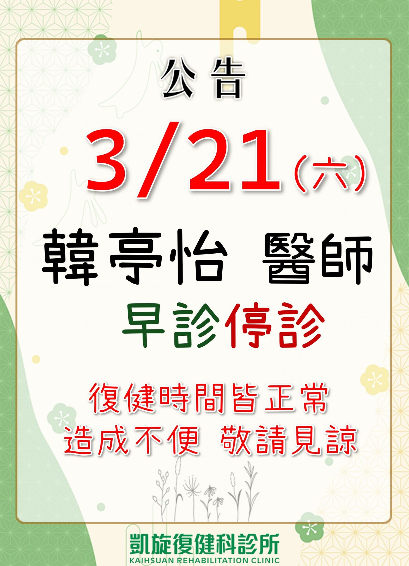 韓亭怡醫師 早診停診