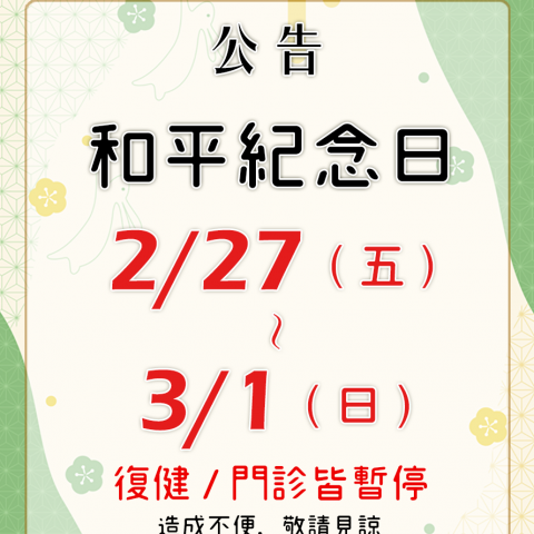 【和平紀念日連假公告】 2/27(五)~3/1(日) 復健/門診皆暫停 造成不便,敬請見諒。