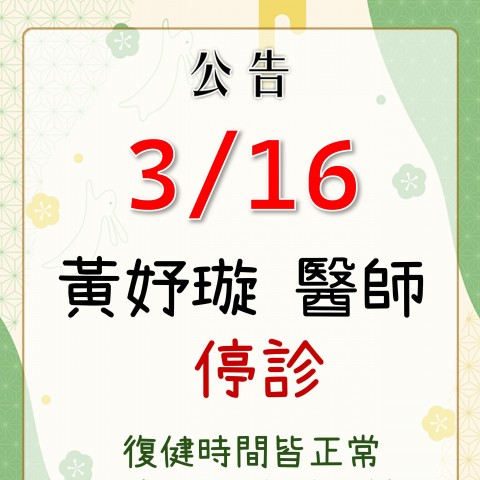 3/16(一) 黃妤璇醫師 午診、晚診停診 復健時間皆正常, 造成不便,敬請見諒。