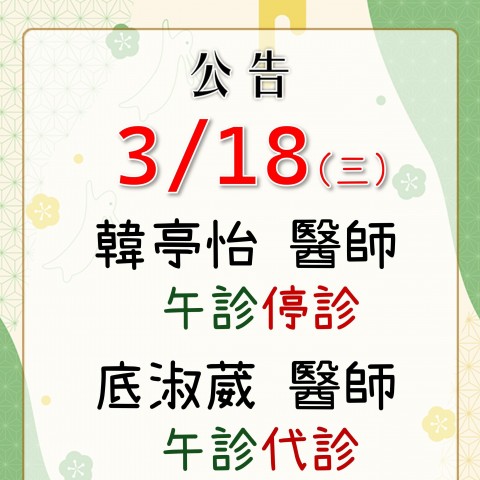 【03月門診異動公告】 3/18(三) 韓亭怡醫師 午診停診 底淑葳醫師 午診代診 - 復健時間皆正常, 造成不便,敬請見諒。