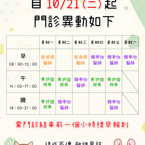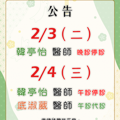 【02月門診異動公告】 2/3(二) 韓亭怡醫師 晚診停診 - 2/4(三) 韓亭怡醫師 午診停診 底淑葳醫師 午診代診 - 復健時間皆正常, 造成不便,敬請見諒。