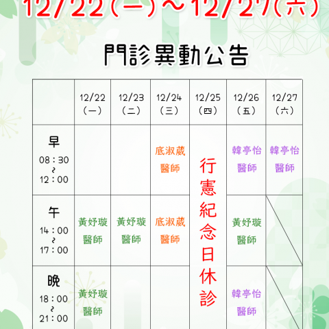 【12月門診異動公告】 12/22(一)~12/27(六) 門診異動如上圖,請民眾多加參閱。