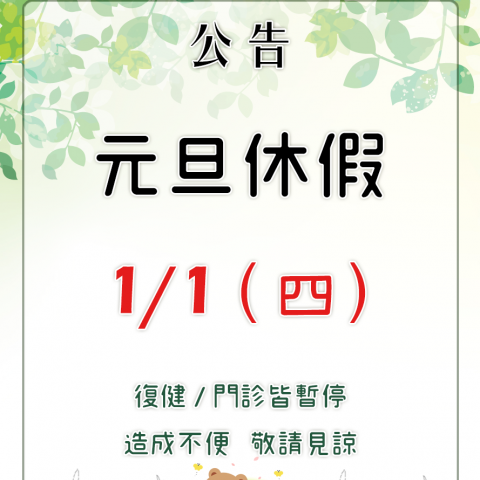 【元旦休假公告】 1/1(四) 休診一日。 復健/門診皆暫停 造成不便,敬請見諒。