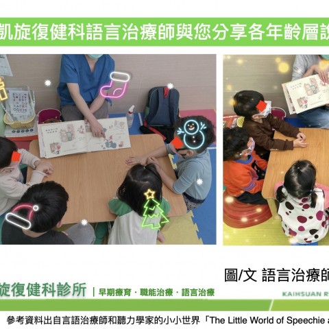 凱旋復健科語言治療師來分享各年齡層說故事的技巧 圖/文 語言治療師 余斐如 首先挑一本合適的繪本,回顧上個月應景的「慌慌張張的聖誕老人」很適合做示範。 角色:聖誕老老人(父親)、聖誕老人(兒子)、六隻馴鹿 Level 1 (3歲-3歲6個月) 這是甚麼? 這是誰? 聖誕老人在做甚麼? 我們在天空中看...