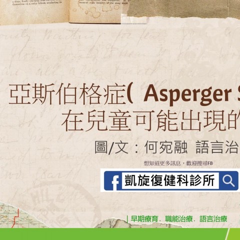 亞斯伯格症在兒童可能出現的特徵 圖/文:語言治療師 何宛融 這個月的衛教文章要來介紹亞斯伯格症(AS),語言治療師何老師整理了幾種常見的常見特徵,通常症狀會在幼兒時期就可能出現,爸爸媽媽們可以看看以下內容,若有擔心可以帶到凱旋復健科診所由醫生及治療師評估,透過專業的協助一...