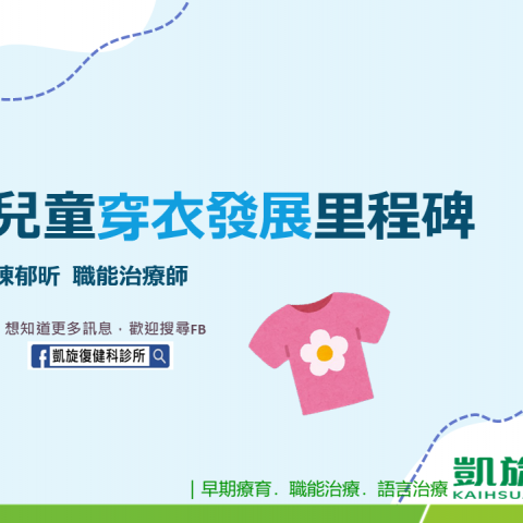 兒童穿衣發展里程碑 圖/文:陳郁昕 職能治療師 這個月的衛教文章是郁昕老師要來說明兒童穿衣發展的里程碑,其實小朋友們從1歲時就已經可以開始自己做出簡單的動作了喔!爸爸媽媽們可以試著放手讓孩子去學習、操作,對於他們的精細動作、生活自理的能力也會有更大的幫助。